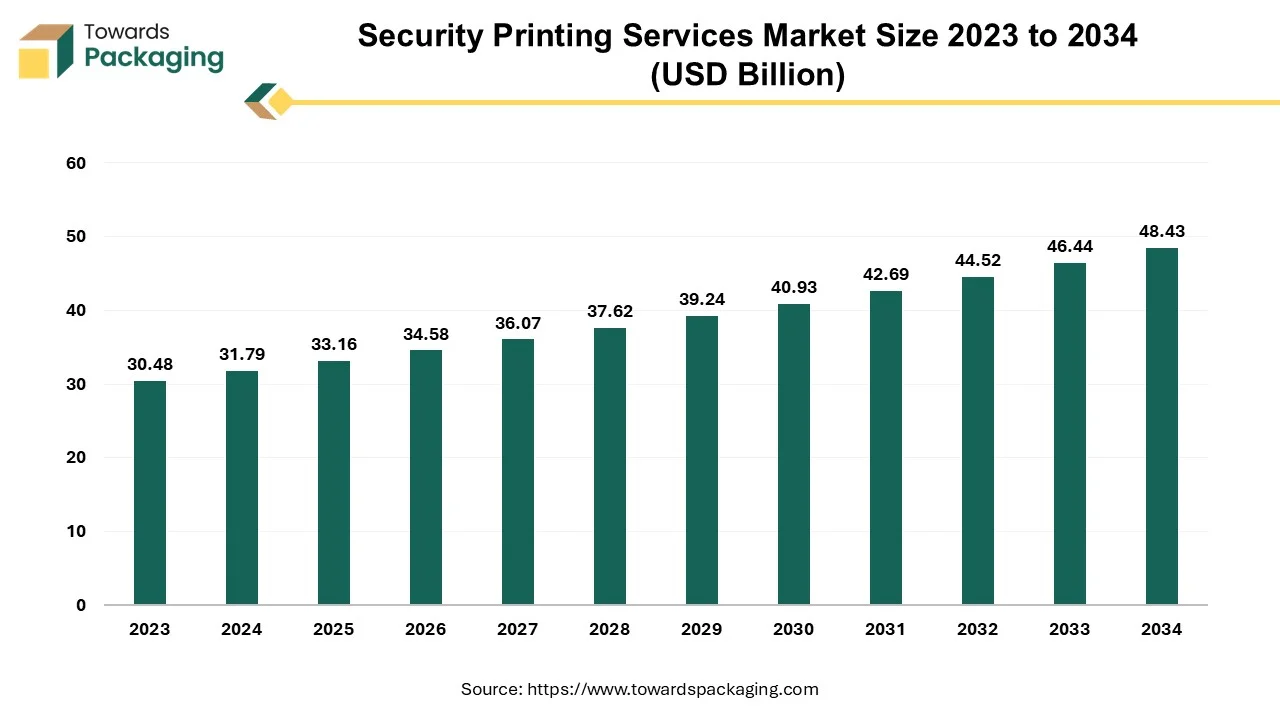 As per market analysts at Towards Packaging, the global security printing services market is expected to grow from USD 34.58 billion in 2026 to nearly USD 48.43 billion by 2034, registering a CAGR of 4.30% between 2025 and 2034.