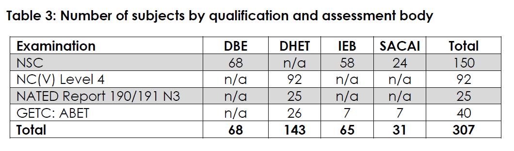 9. The information in Table 3 shows that 307 subjects were examined across the four qualifications and assessment bodies.